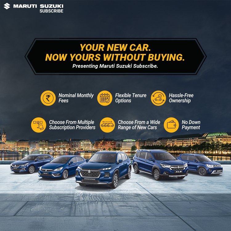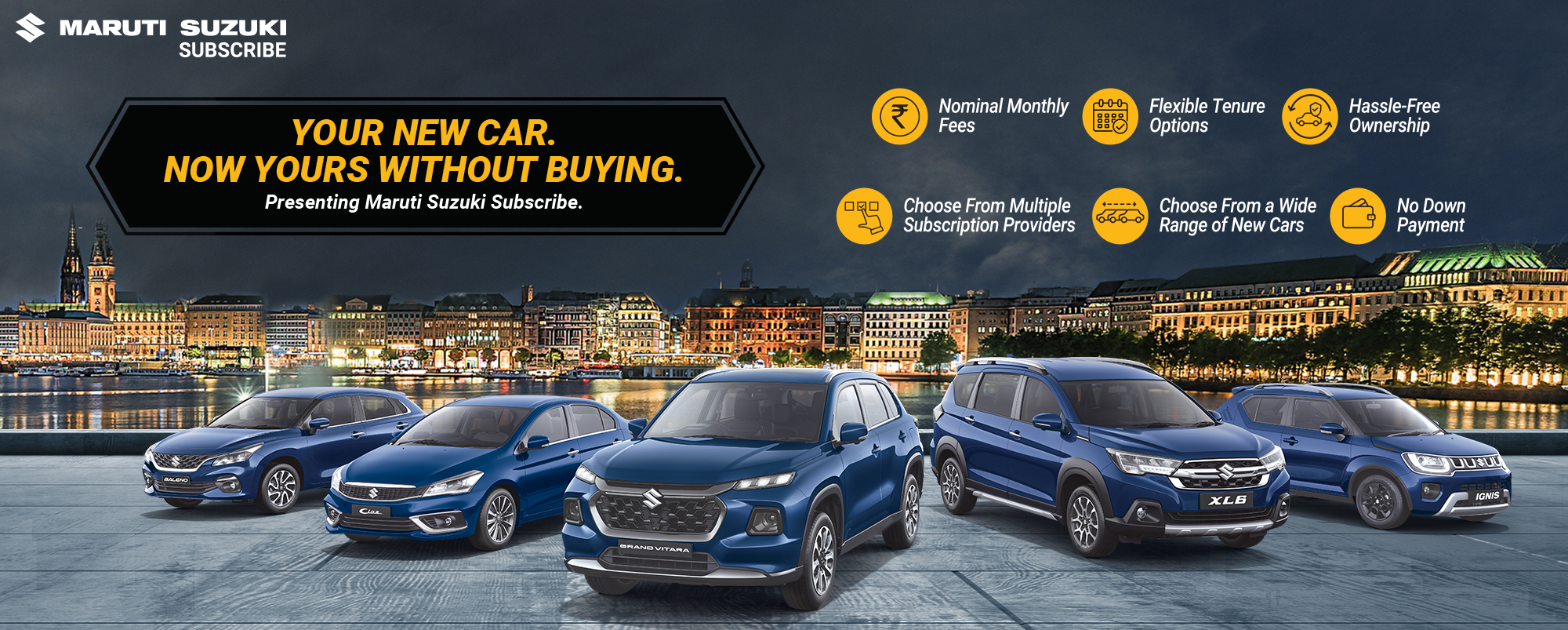 Maruti Suzuki Subscribe enables all customers to enjoy driving their preferred Maruti Suzuki cars without having to deal with all the financial responsibilities that come with owning a car.All you need to do is opt for a monthly subscription plan at a fixed monthly fee, which includes the routine maintenance and insurance costs, and choose a flexible tenure. At Kataria Automobile in, , vapi, all Hatchback, Sedan, SUV, the MUV models line-up includes Baleno, Invicto, EVitara, Jimny, Ciaz, Ignis, Fronx, Grand Vitara, XL6. Here, you will enjoy Maruti Suzuki Subscribe benefits such as: